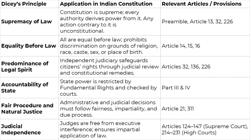 The Indian Constitution effectively incorporates and expands Dicey’s principles to suit a modern democratic and welfare state. Let’s see how each principle operates within the Indian framework.